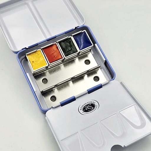 An elegant, heather-colored metal case holds four carefully selected half-pans of Aquarius watercolors: